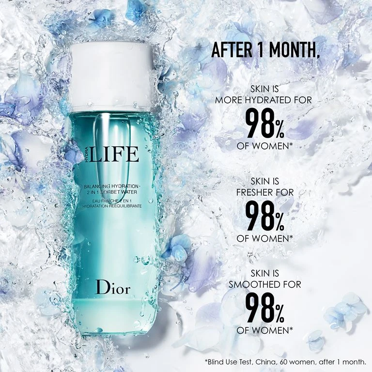 Hydra Life Sorbet Water Facial Toner fra DIOR. En toning lotion infunderet med en præbiotika der samtidig fugter, afbalancerer og forskønner huden. Som en bølge af friskhed, hjælper denne kraftfulde toning lotion, der er beriget med præbiotika, med at fugte og afbalancere huden, mens den samtidig minimerer uperfektheder på huden såsom porer og fedtet hud. Huden er fugtet og blød. Dag efter dag syner huden ultra sund og naturlig smuk. Ved samtidig brug af Sorbet creme, forbedrer denne toning lotion hudfugtigheden.